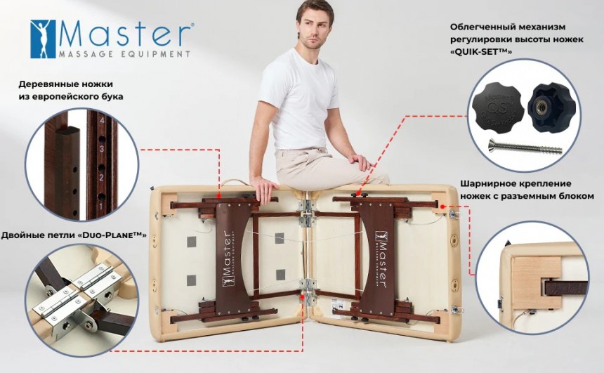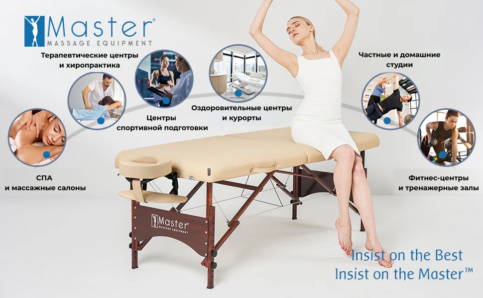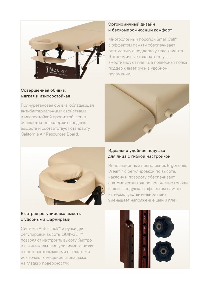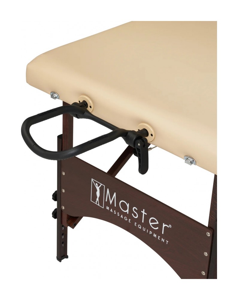 Универсальный складной массажный стол Master Massage Argo шириной 71 см Наш универсальный переносной стол Argo шириной 71 см подходит как для массажа, так и для тренировок на столе. 4-сантиметровый наполнитель Small Cell Foam обеспечивает комфорт и поддержку, позволяя выполнять аэробные и анаэробные упражнения прямо на поверхности стола, не опускаясь на пол. Ваш клиент или близкий человек может насладиться расслабляющим массажем, а вы — улучшить гибкость и укрепить мышцы всего тела, не нагружая позвоночник во время растяжек. Несмотря на малый вес — всего около 13,6 кг — складной стол Argo отличается прочностью и удобством. Он оснащён мягкой обивкой из полиуретана, устойчивого к маслам и влаге. Надёжная конструкция стола выдерживает нагрузку до 204 кг. Стол легко раскладывается за считанные секунды благодаря системе автоматической фиксации ножек Auto-Lock. Ножки изготовлены из европейского бука с ореховым покрытием и защищены прочным лаком Dura Seal. Всё используемое дерево не содержит формальдегида и канцерогенов, соответствуя экологическим стандартам Калифорнийского совета по качеству воздуха (CARB).